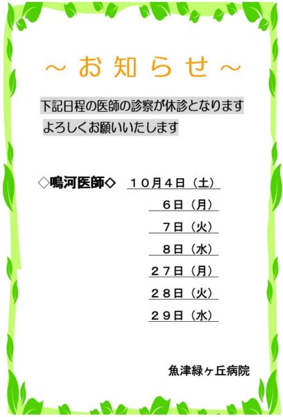 4階病棟にて患者様にコロナ感染を確認いたしましたので、当面の間面会を中止させていただきます。ご迷惑をお掛けいたしますが、よろしくお願いいたします。